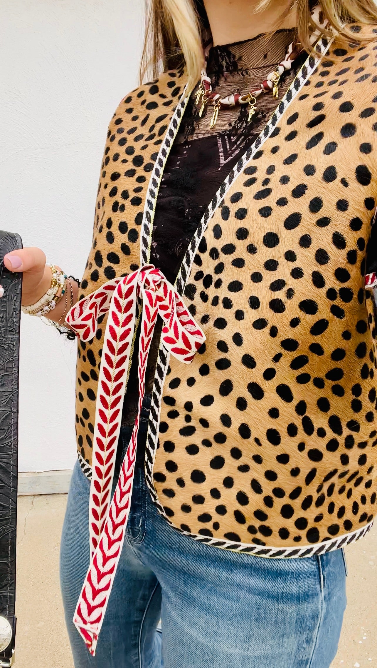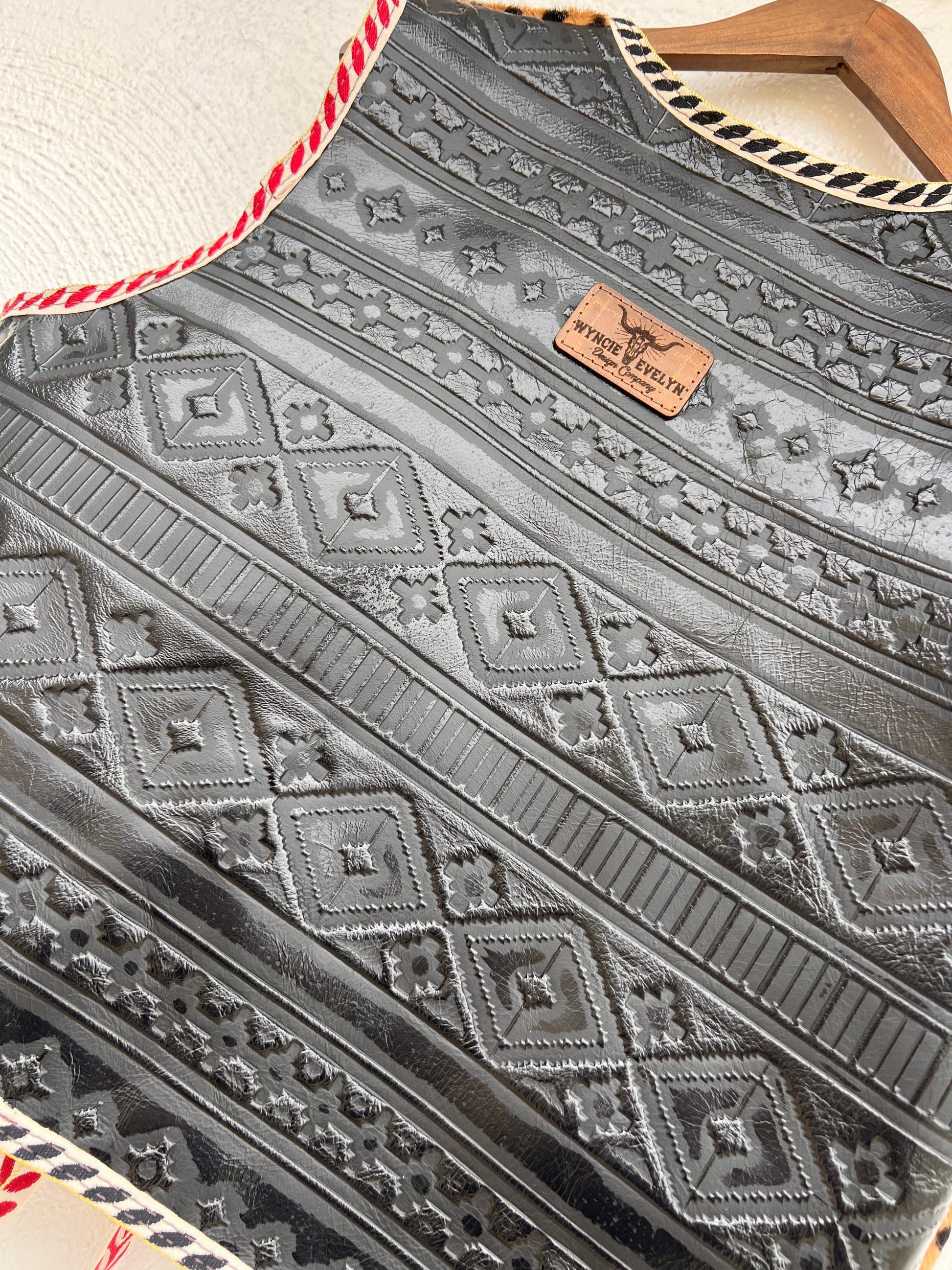 Genuine printed cowhide and leather vest. The back features a beautiful all black Navajo design.