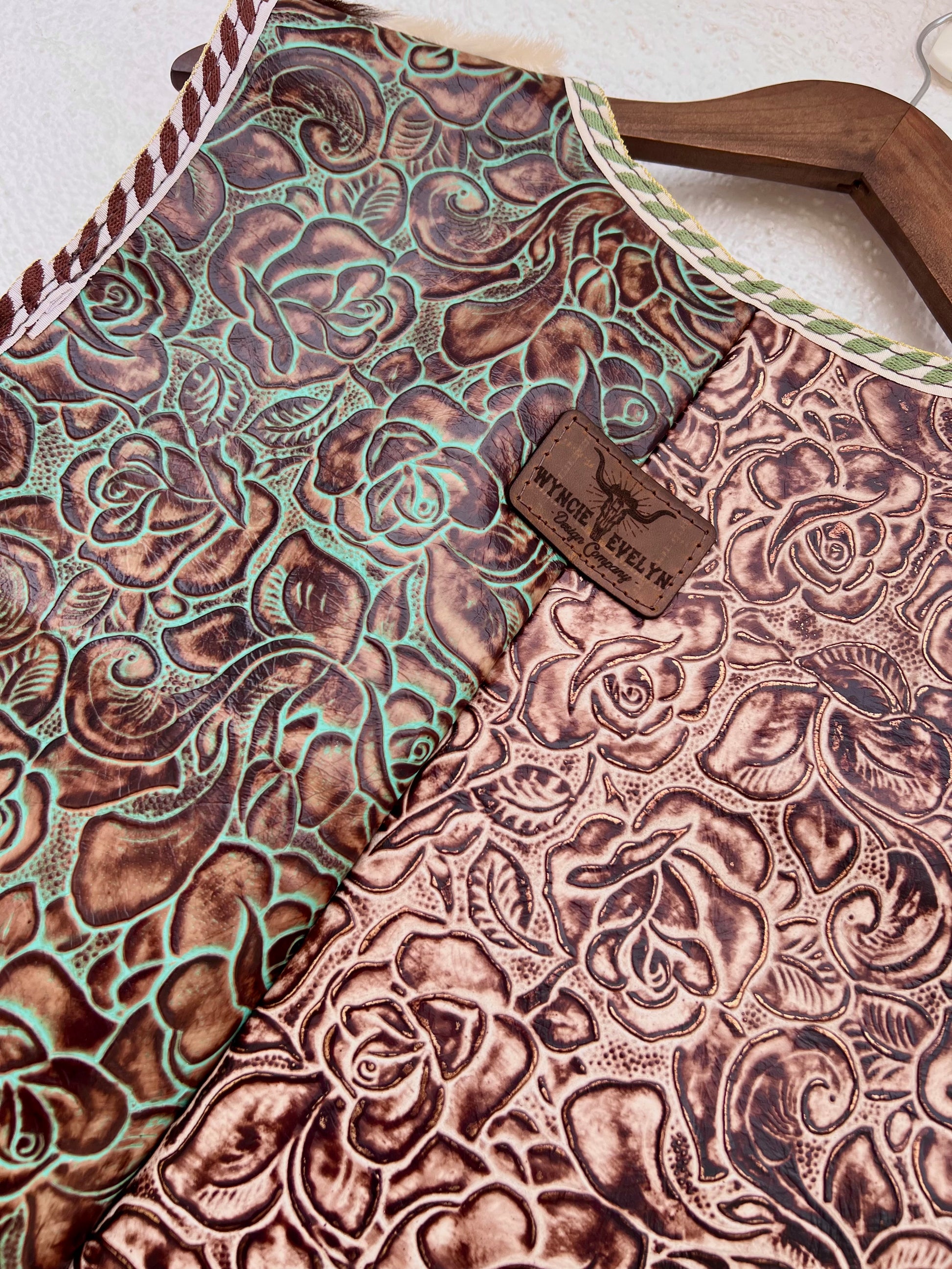 Genuine cowhide and leather vest. The back features a beautiful split leather design with turquoise brown and gold accents. A Wyncie & Co. patch was added to the back after photos were taken.
